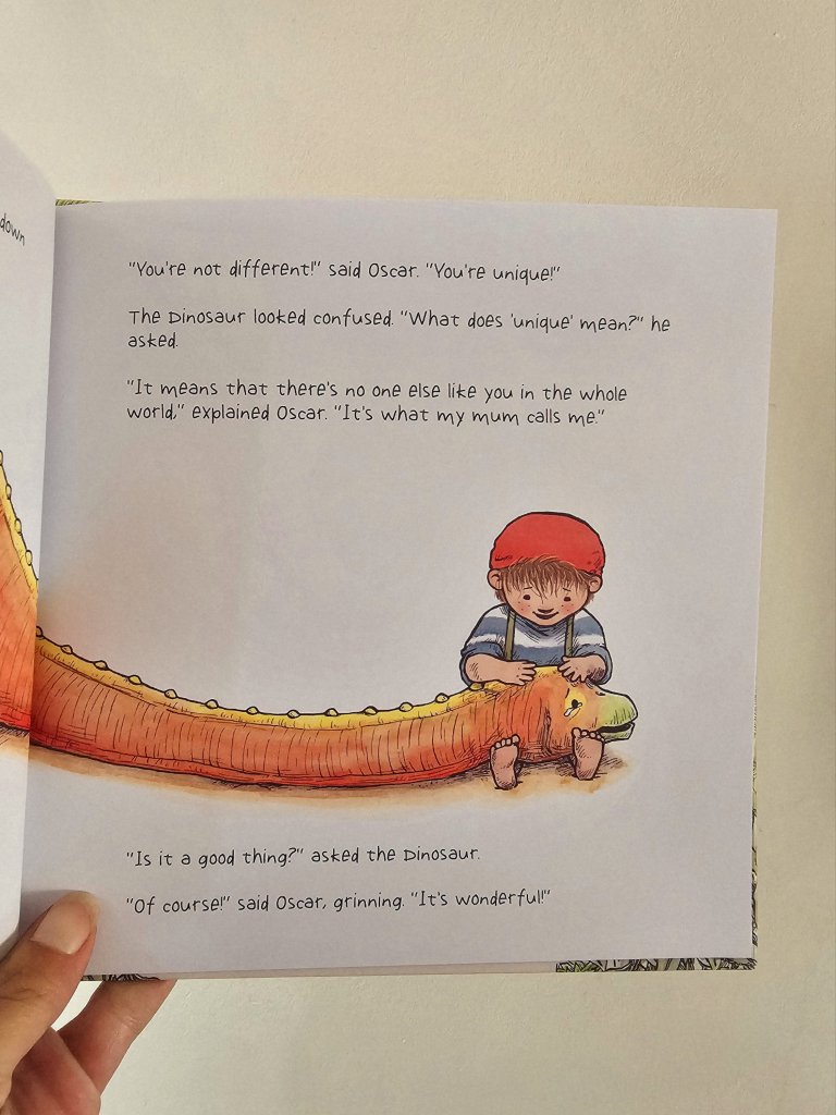 In the end, I decided we needed ‘be unique’, as you can see. The story involves a kind-hearted dinosaur who doesn’t know what he is, then with the help of our hero (my youngest Oscar in this case) he discovers what he is and that being different isn’t a bad thing.